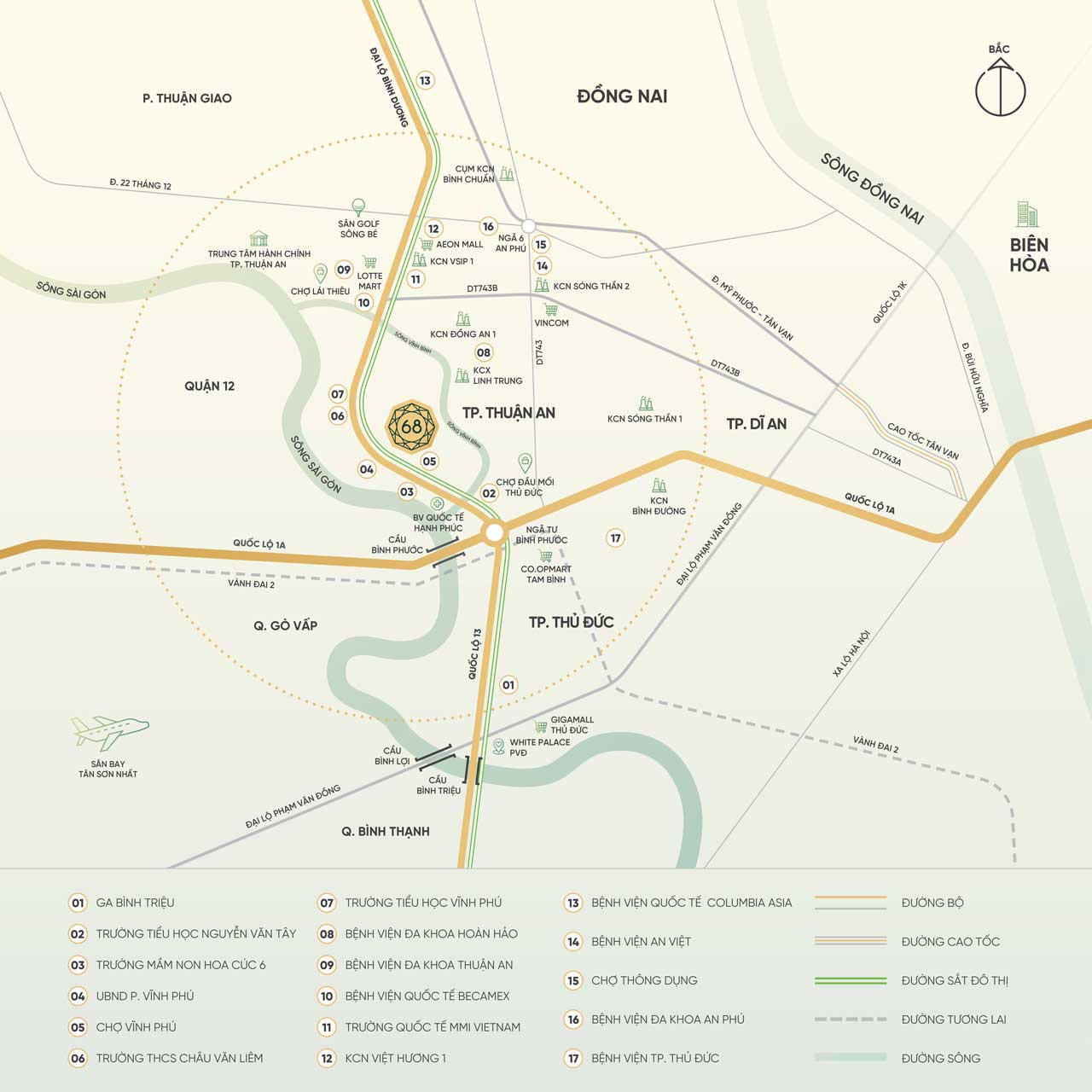 Bên cạnh đó, khu vực Thuận An còn tập trung nhiều tiện ích ngoại khu như trung tâm thương mại, bệnh viện quốc tế, trường học và các khu công nghiệp lớn. Điều này tạo nên một hệ sinh thái hoàn chỉnh, đáp ứng nhu cầu sống – làm việc – giải trí của cư dân.